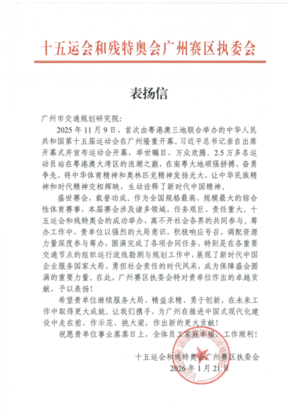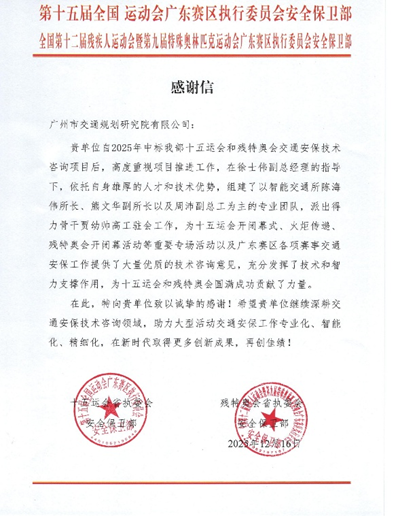 近日,十五运会和残特奥会执委会多个部门发来感谢信,对广州市交通规划研究院有限公司(以下简称“广交研”)在赛事筹备与运行期间提供的坚实技术支撑与服务保障予以高度肯定。信中赞誉广交研团队“专业高效、作风过硬”,为赛会“顺利、精彩、圆满”举办作出了重要贡献。这份荣誉背后,是广交研以专业护航活动赛事的集中体现,更是全体工作人员恪尽职守、协同攻坚的生动写照,派驻执委会骨干代表的工作缩影共同构成了广交研交通保障能力的生动诠释。