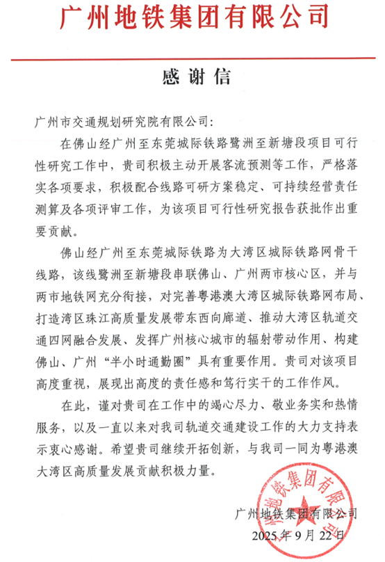 甲方的感谢信不仅是对项目组全体成员专业技术能力的充分肯定,也是对我单位整体技术实力和服务质量的高度认可。未来,我们将继续恪守精益求精的工匠精神,持续提升专业技术能力与服务品质,为粤港澳大湾区轨道交通高质量、一体化发展贡献更大力量。