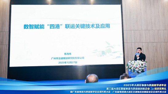 会上,市交研院智能交通所所长陈海伟以获奖项目为核心,发表《数智赋能“四港”联运关键技术及应用》主题演讲,系统阐述数智技术在推动“四港”联动、提升物流整体效能方面的创新路径与实践经验,得到与会专家学者的广泛关注与高度认可。