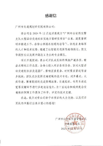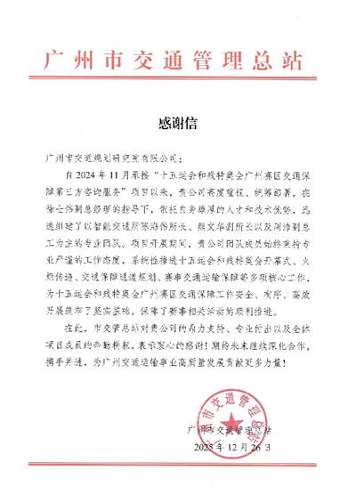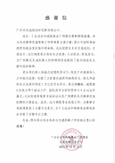 近日,十五运会和残特奥会执委会多个部门发来感谢信,对广州市交通规划研究院有限公司(以下简称“广交研”)在赛事筹备与运行期间提供的坚实技术支撑与服务保障予以高度肯定。信中赞誉广交研团队“专业高效、作风过硬”,为赛会“顺利、精彩、圆满”举办作出了重要贡献。这份荣誉背后,是广交研以专业护航活动赛事的集中体现,更是全体工作人员恪尽职守、协同攻坚的生动写照,派驻执委会骨干代表的工作缩影共同构成了广交研交通保障能力的生动诠释。