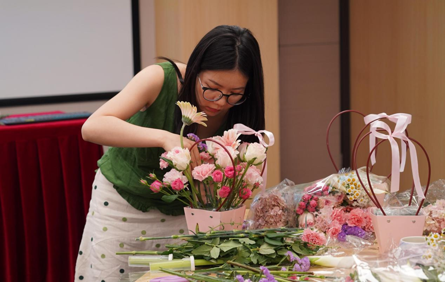 活动现场花香四溢、温馨雅致。在 1.5 小时的美好时光里,专业花艺师细致讲解花艺知识,现场演示插花技巧,从花材搭配、色彩组合到造型设计,一步步带领大家感受花艺的魅力。职工们化身花艺师,手持花剪,精心挑选玫瑰、桔梗、小雏菊等鲜切花,修枝、配色、造型,将一朵朵鲜花错落搭配,赋予它们全新的美感。大家相互交流、切磋技艺,欢声笑语萦绕全场,原本零散的花材,在一双双巧手下变成了一件件独具匠心的花艺作品。