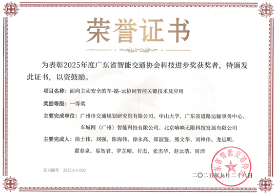 我院与中山大学、广东省道路运输事务中心、车城网(广州)智能科技有限公司、北京嘀嘀无限科技发展有限公司合作研发的《面向主动安全的车-路-云协同管控关键技术及应用》项目,凭借在智能交通领域的突出创新性与实践价值,成功获评“2025年度广东省智能交通协会科技进步奖一等奖”。我院智能交通所所长陈海伟应邀出席大会,并代表合作团队参与颁奖典礼。